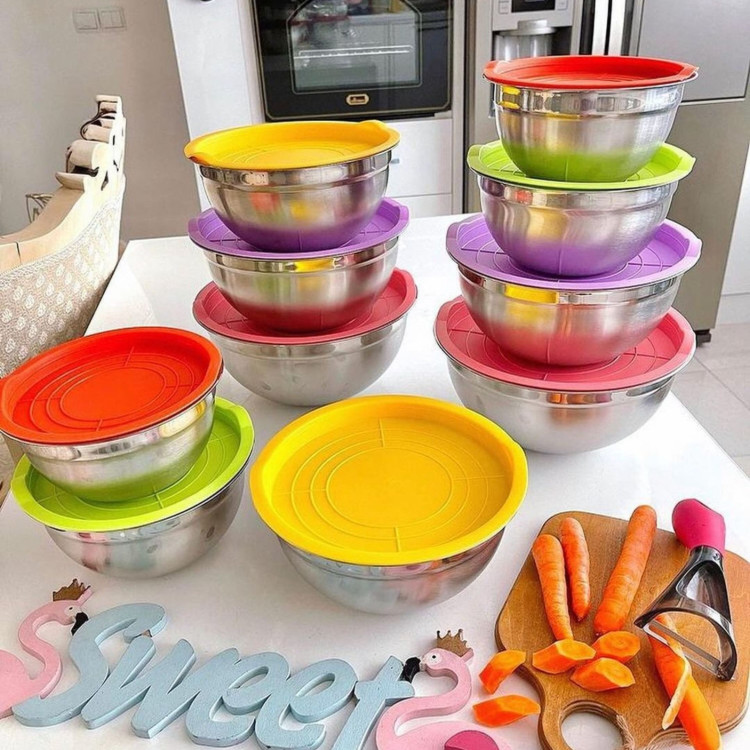 استیل با کیفیت، ضد زنگ، با خلوص بالا در پنج سایز 18_20_22_24_26 سانتی متر لگن آشپزخانه دارای درب و بدنه رنگی و استیل دارای درب از جنس پلاستیک مرغوب و کاملا بهداشتی مناسب آشپزی و کارهای روزمره آشپزخانه و نگهداری مواد غذایی درب کاملا کیپ میشود