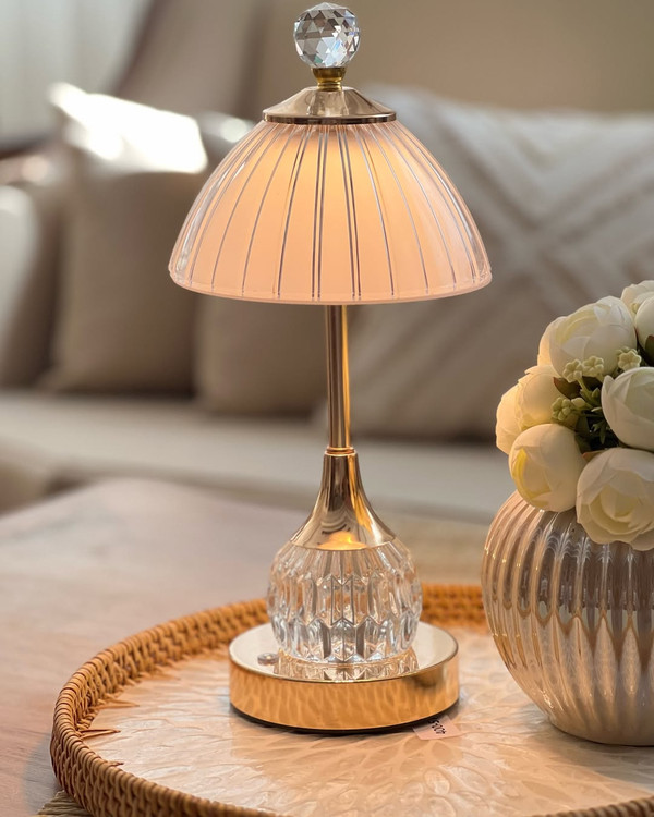 دارای پایه طلایی رنگ، بدنه کریستالی شفاف و کلاهک (شید) سفید رنگ با خطوط عمودی است.