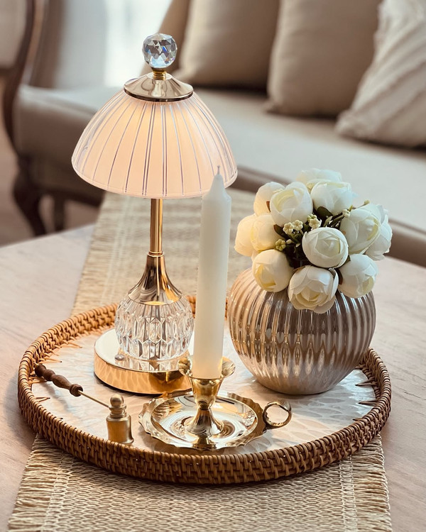 یک گوی کریستالی کوچک در بالای کلاهک قرار دارد و پایه کریستالی آن دارای برشهای تزئینی است که نور را منعکس میکند.