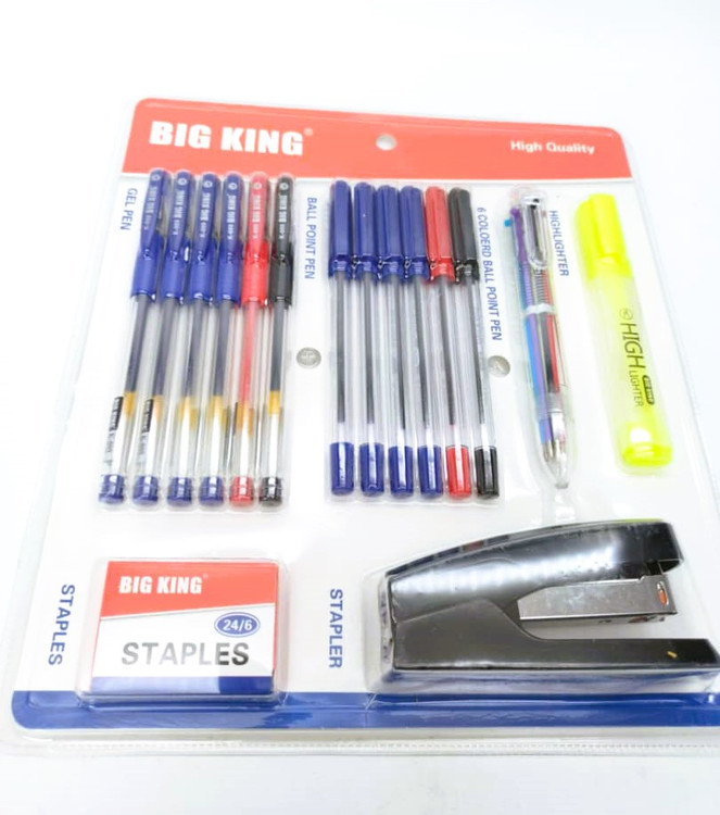 ست لوازمالتحریر BIG KING یک مجموعهی کامل و کاربردی برای دانشآموزان، دانشجویان و کارمندان اداری است. این پک شامل انواع خودکار در رنگهای مختلف، رواننویس، مدادنوکی، هایلایتر، منگنه و بسته سوزن منگنه میباشد.