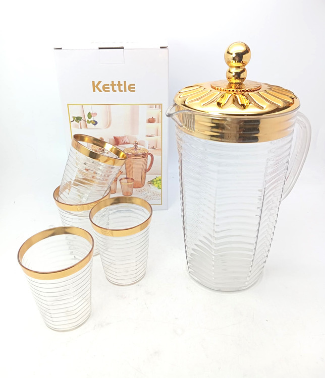 سرویس پارچ و لیوان آکرولیک لبطلا، انتخابی شیک و مقاوم برای پذیرایی روزمره یا مهمانیهای خاص شماست. طراحی شفاف و کریستالی به همراه لبههای طلاییرنگ، زیبایی خاصی به میز پذیرایی میبخشد. این ست شامل یک پارچ جادار و چهار لیوان همطرح است که بهراحتی برای سرو انواع نوشیدنیهای گرم یا سرد قابل استفاده هستند.