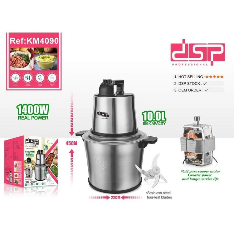 سبزی خردکن و غذاساز DSP مدل KM4090 یک دستگاه حرفهای و قدرتمند برای آشپزخانههای خانگی و حتی استفاده نیمهصنعتی است. این دستگاه با توان 1400 وات واقعی و ظرفیت بسیار بالای 10 لیتر، انتخابی ایدهآل برای خرد کردن انواع سبزیجات، گوشت، پیاز، سیر و سایر مواد غذایی به شمار میرود.